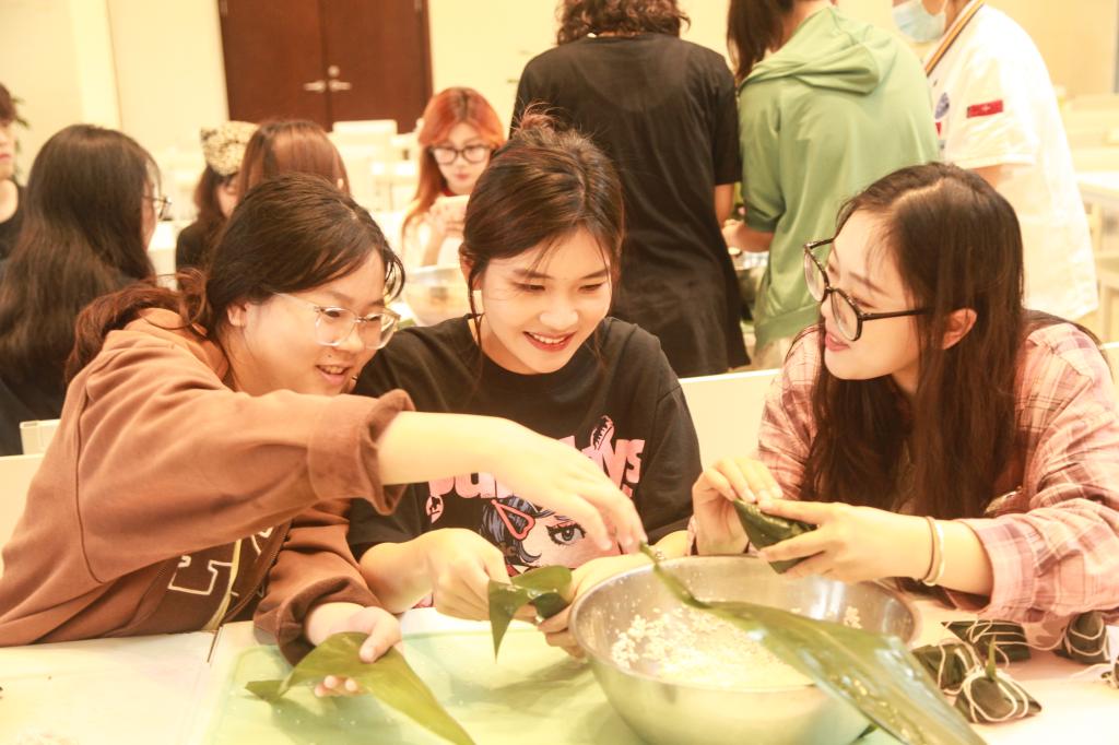 活动现场,粽叶、糯米和蜜枣等食材一应俱全,食堂师傅手把手指导同学们捋叶、填米、包粽子,体验端午节日气氛,并通过DIY手工制作龙舟、五彩绳、各式香囊,体验了传统手工艺的独特魅力。同学们纷纷表示,虽然端午节不能回家和家人过节,当五彩绳戴在手上的那一刻感觉心里很暖、很幸福。